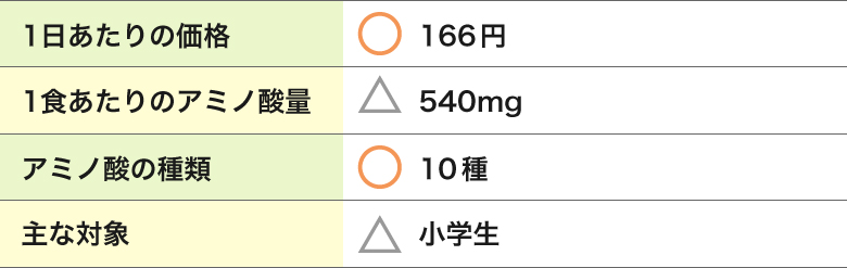 アミノ酸量においては540㎎と、成長期のアスリート中高生には少し物足りないところがあるため、うまく他のサプリと組み合わせるか、多めに飲むといった工夫が実感につながりやすそうです。